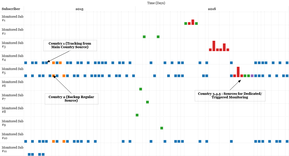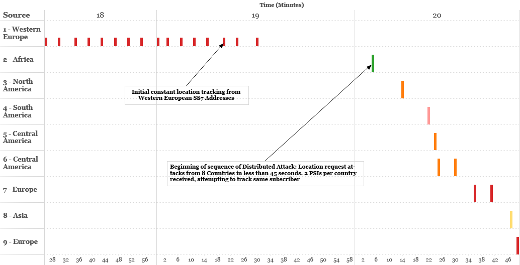 time series diagram mapping examples of SS7 tracking platform WODEN activity